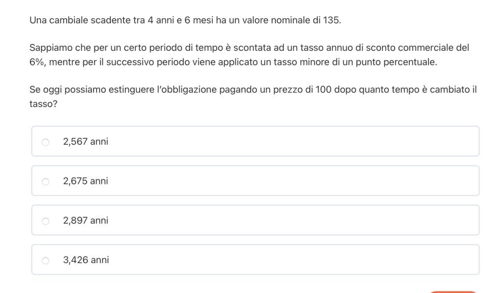 $$ M= 135 \quad C = 100 \quad d_1= 6\% \quad d_2 = 5\% \quad t_1+t_2= 4,5 \text{ anni} $$