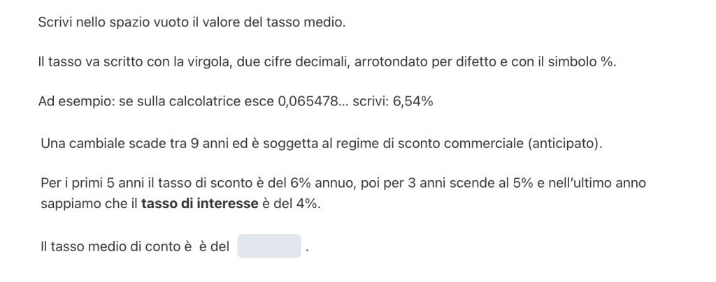 Attenzione che l’ultimo tasso che ci viene dato è quello di interesse, pertanto calcoliamo il relativo tasso di sconto con la seguente formula: