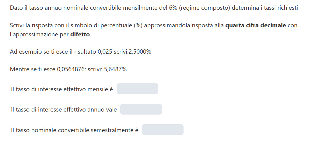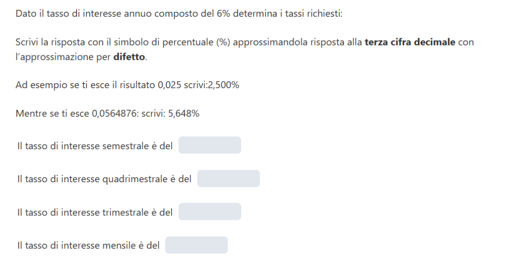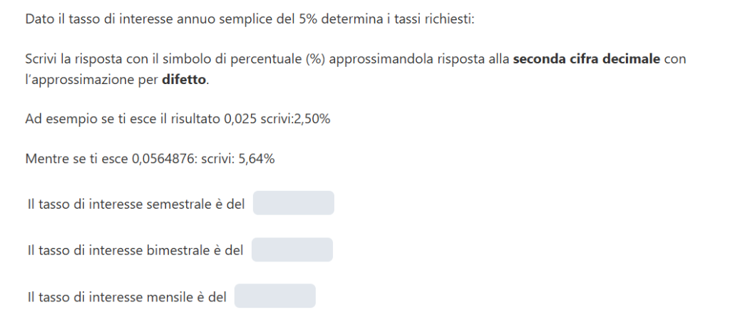 I tassi di interesse semestrale, bimestrale e mensile semplici risultano rispettivamente:
