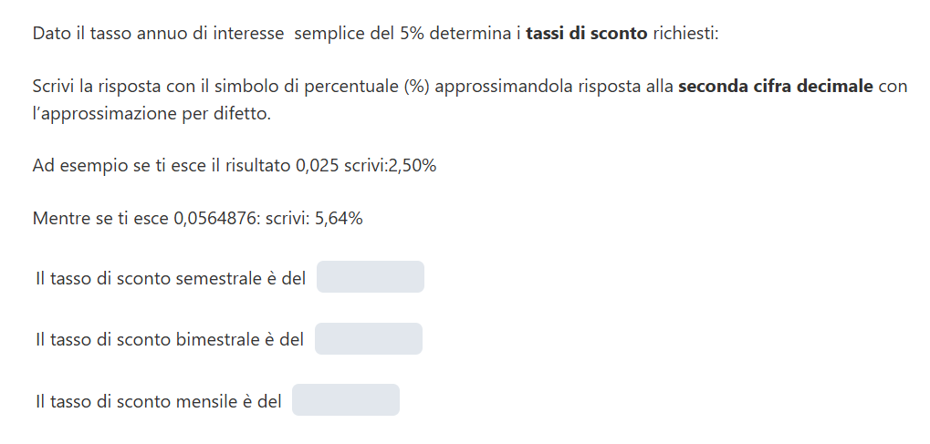 Per ricavare i tassi di sconto semestrale, bimestrale e mensile nel regime semplice sfruttiamo la relazione che lega il tasso di sconto al tasso di interesse: