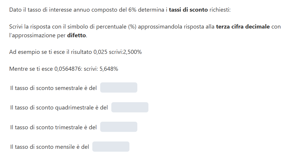 Per calcolare i tassi di sconto corrispondenti (nel regime composto) sfruttiamo i risultato dell’esercizio precedente e la seguente relazione che li lega al tasso di interesse: