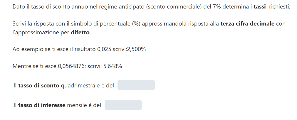 Da notare che nelle risposte inseriamo gli ultimi risultati, ovvero con due cifre decimali arrotondati per difetto ed il simbolo di percentuale (%).