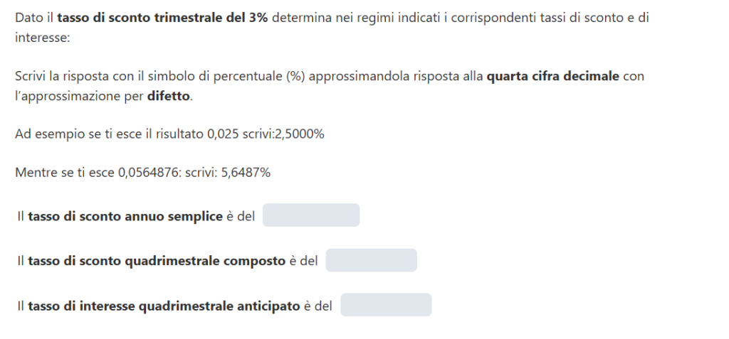 Da qui possiamo calcolare il tasso di interesse quadrimestrale (i3) con la relazione che lo lega al tasso di sconto quadrimestrale (d3) appena calcolato:
