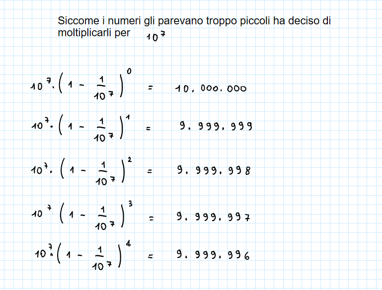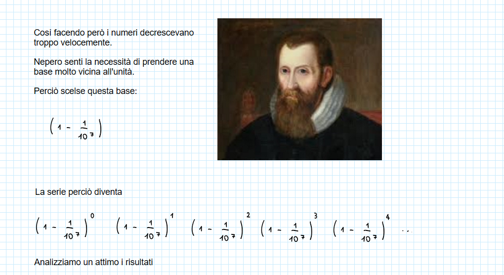 Poiché i valori $\left(1 – \frac{1}{R}\right)^n$ diventano molto piccoli molto rapidamente, Nepero li moltiplicava per $R = 10^7$ per ottenere numeri interi gestibili per le sue tabelle. Questo faceva sì che i “numeri” (che per lui erano i seni) fossero grandi interi.