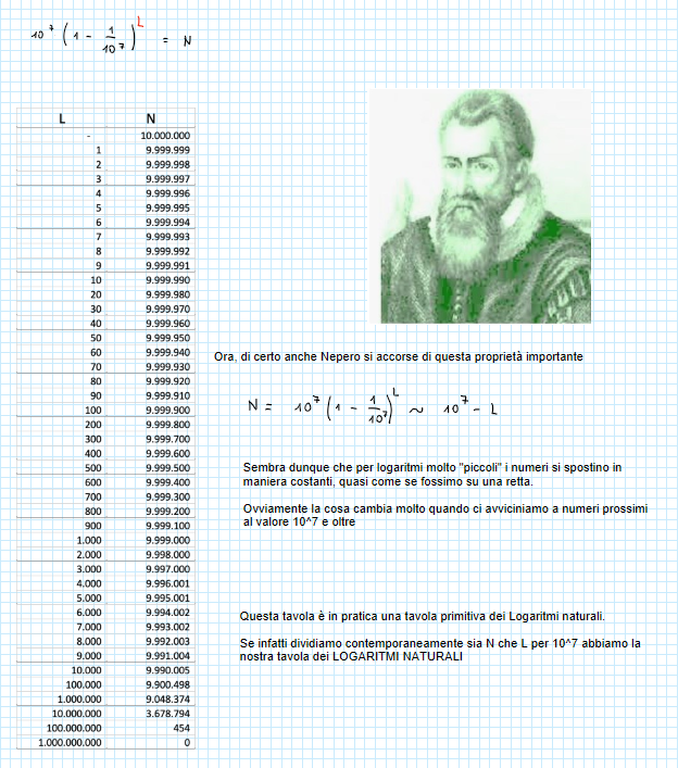 - In generale, per un logaritmo $n$, il numero corrispondente è $R \cdot \left(1 – \frac{1}{R}\right)^n = 10^7 \cdot \left(1 – \frac{1}{10^7}\right)^n$. L’esponente $n$ in questa formulazione è ciò che Nepero definiva il suo logaritmo.