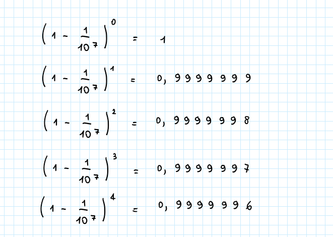 - Per un logaritmo $1$, il numero è $R \cdot \left(1 – \frac{1}{R}\right)^1 = 10^7 \cdot \left(1 – \frac{1}{10^7}\right) = 10^7 – 1 = 9999999$.