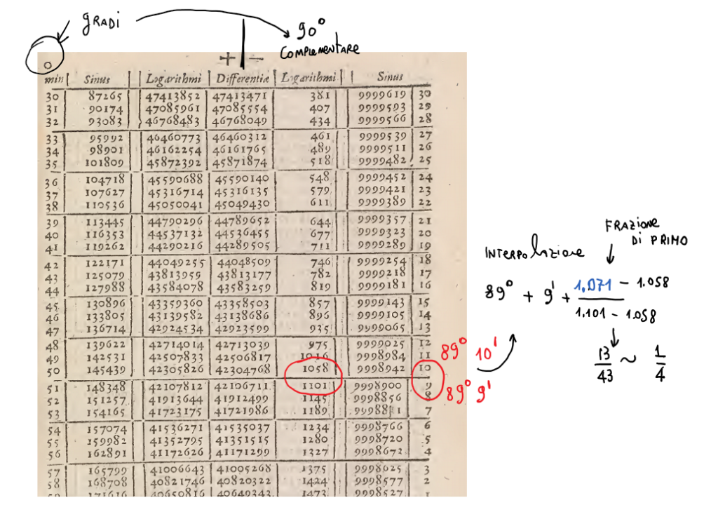 Ora, Nepero cerca nella sua tabella quale angolo ha un logaritmo di $1071$. La sua tavola è organizzata in modo da indicare l’angolo o il suo complemento. Per il valore $1071$, egli trova che il logaritmo corrisponde al complemento di $0$ gradi $50$ primi e circa $1/4$ di primo. Questa frazione è ulteriormente raffinata a $13/43$ di minuto tramite interpolazione.