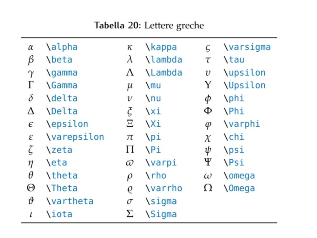 Cominciamo con lettere dell’alfabeto greco scritte in linguaggio LATEX: minuscole e maiuscole